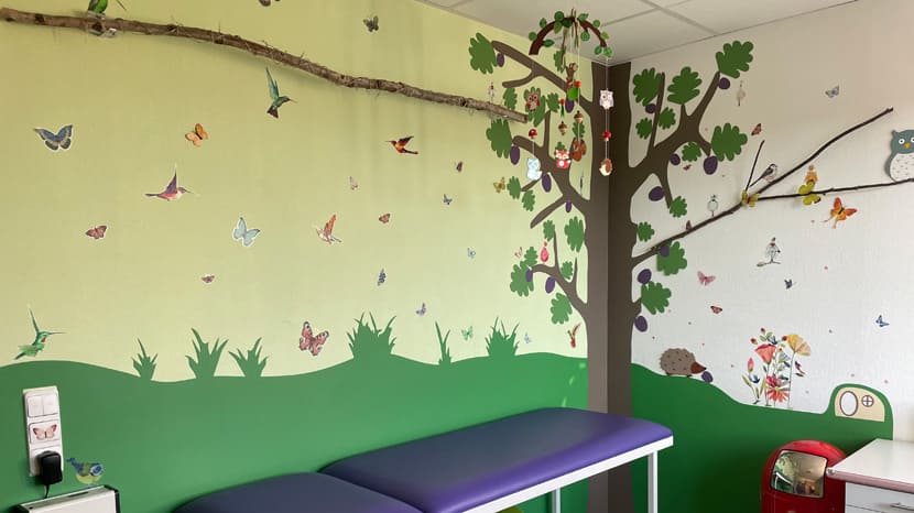 Dr. Mia Trendafilow hat für ihre Kinderarztpraxis im hessischen Haiger gemeinsam mit Wandschutz Nielsen farbenfrohe und detailreiche Themenwelten geschaffen. Sie nehmen jungen Patienten die Angst vor Arztbesuchen – und schützen gleichzeitig die Wände vor Schmutz oder Schrammen.